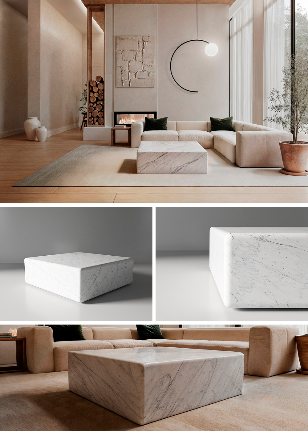 Minimalism at its Finest: Understated, elegant, and timeless. This cubic coffee table, crafted from natural marble, is the definition of sophisticated minimalism. Its pure geometric shape, with gently rounded edges, highlights the beauty of the marble's natural veins, creating a piece that adds character without being overstated.