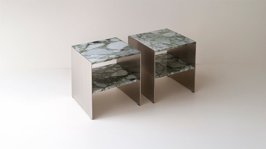 Con líneas limpias y presencia contundente, esta mesita combina un sobre de mármol Ice Jade —con vetas naturales en tonos verdes y blancos— con una base metálica de diseño angular. La fusión entre materia noble y estructura minimalista crea una pieza con personalidad serena y atemporal, ideal para espacios que valoran el detalle y la pureza formal.