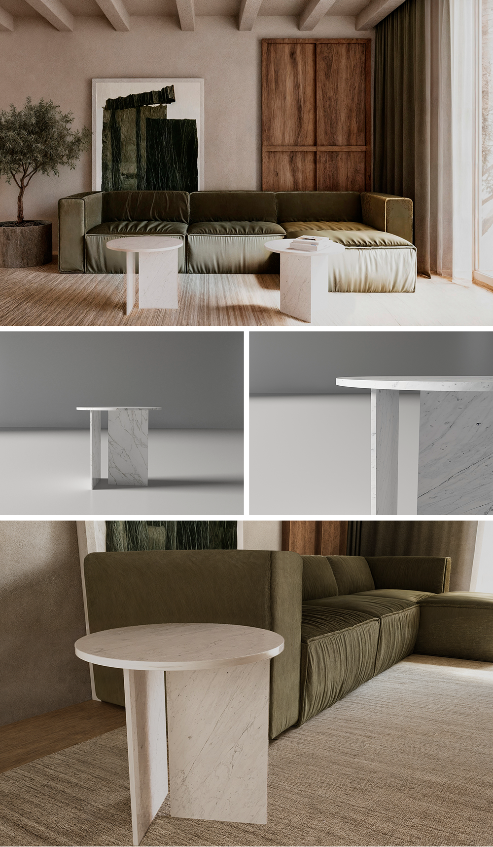La Mesita Denisse combina líneas arquitectónicas con la pureza visual de la piedra natural. Su diseño geométrico y minimalista la convierte en una pieza escultural ideal para espacios que buscan sofisticación con carácter.