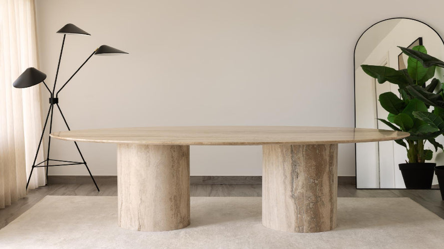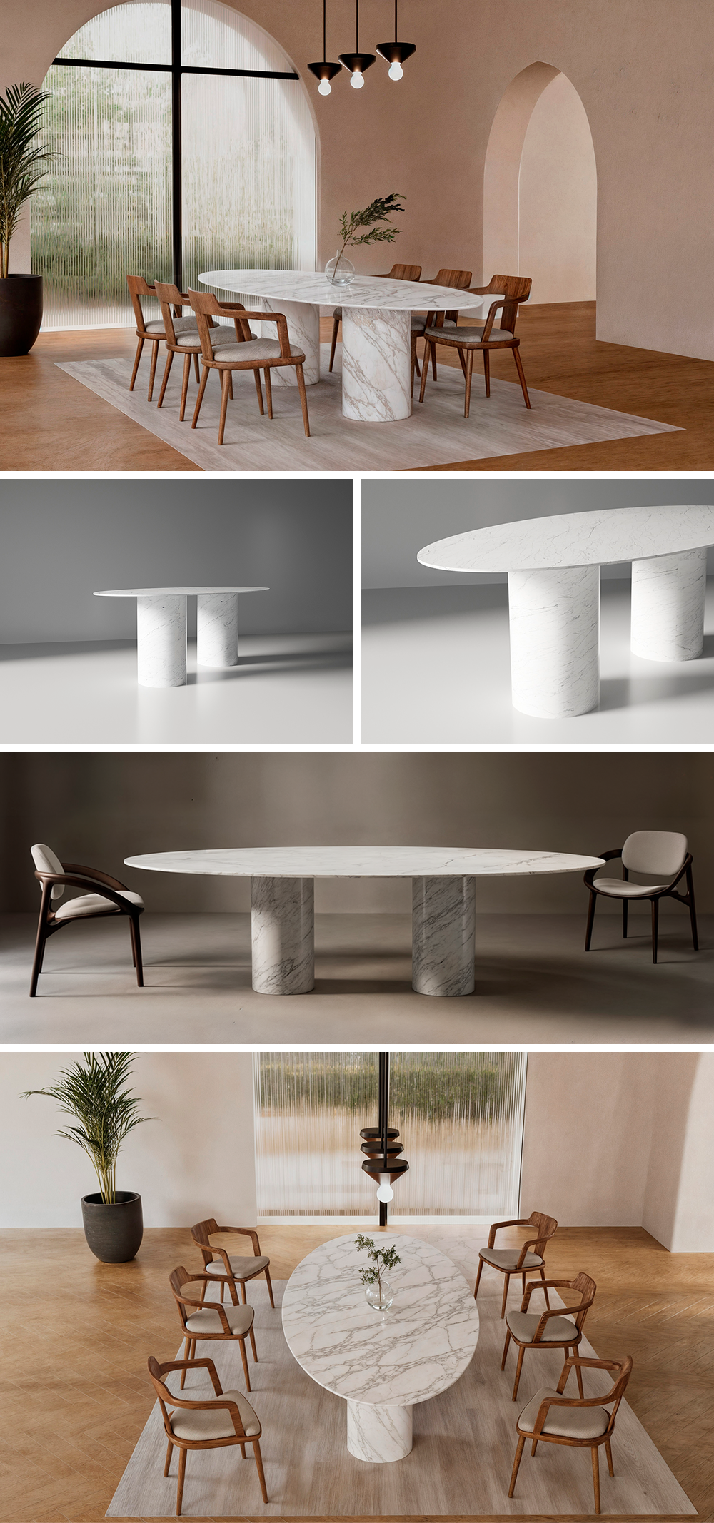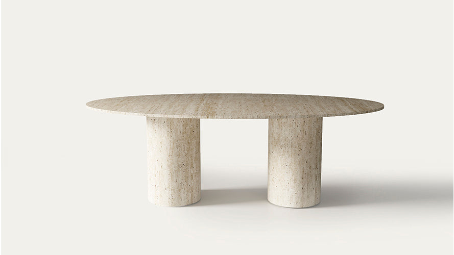 La Mesa Grace impresiona con su diseño escultural. Dos bases cilíndricas sostienen una tapa ovalada, creando una pieza atemporal que aporta calidez y carácter a cualquier espacio.